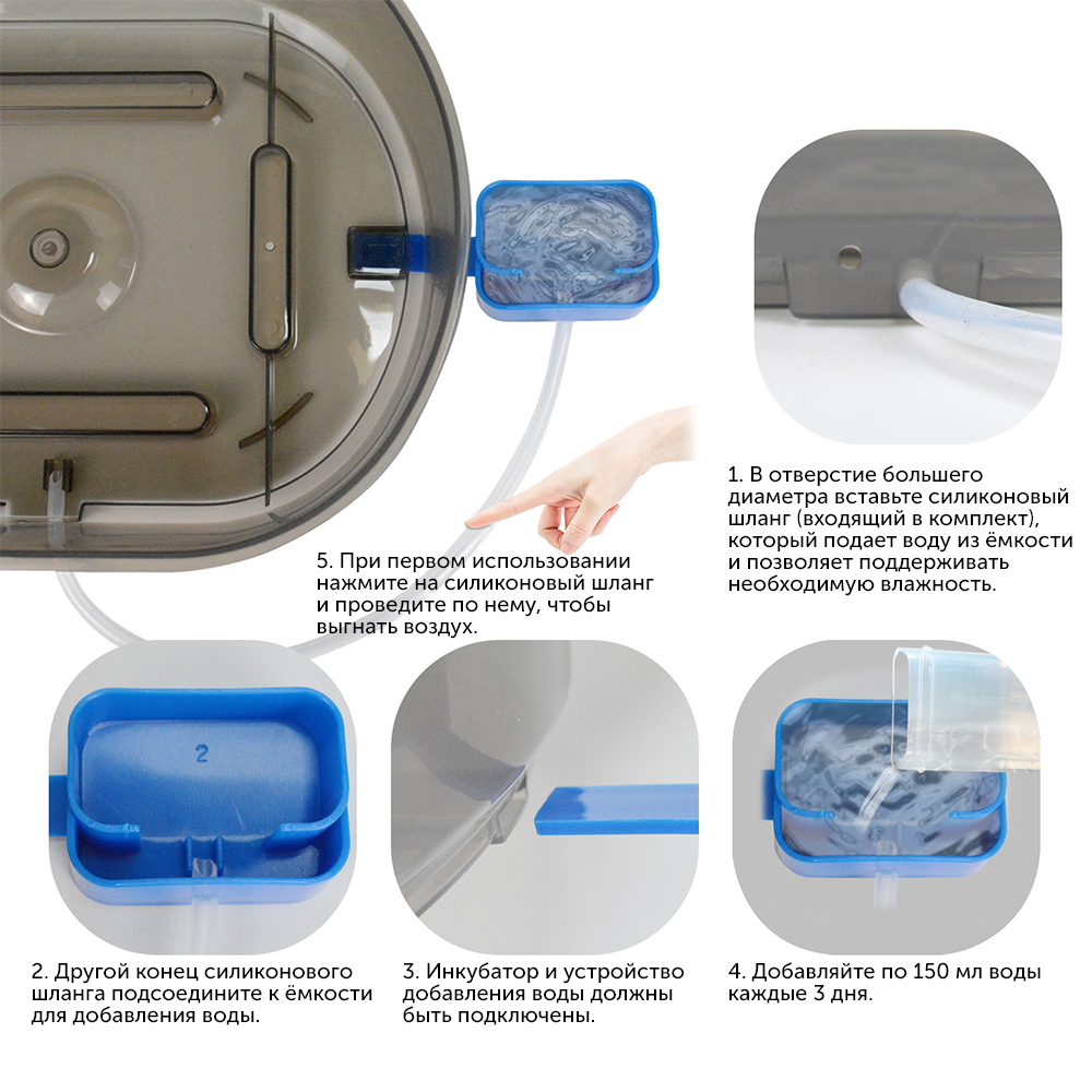 - Поддержание влажности: вода поступает в инкубатор через силиконовый шланг из емкости, что помогает поддерживать необходимую влажность в процессе инкубации.