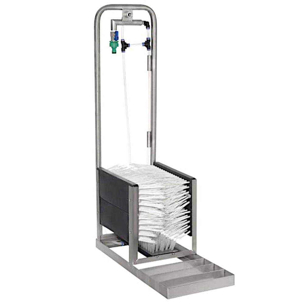Рама изготовлена полностью из нержавеющей стали. Подключается напрямую к водопроводу. Автоматически всасывает жидкие чистящие средства и распределяет их по 5 нейлоновым щеткам.