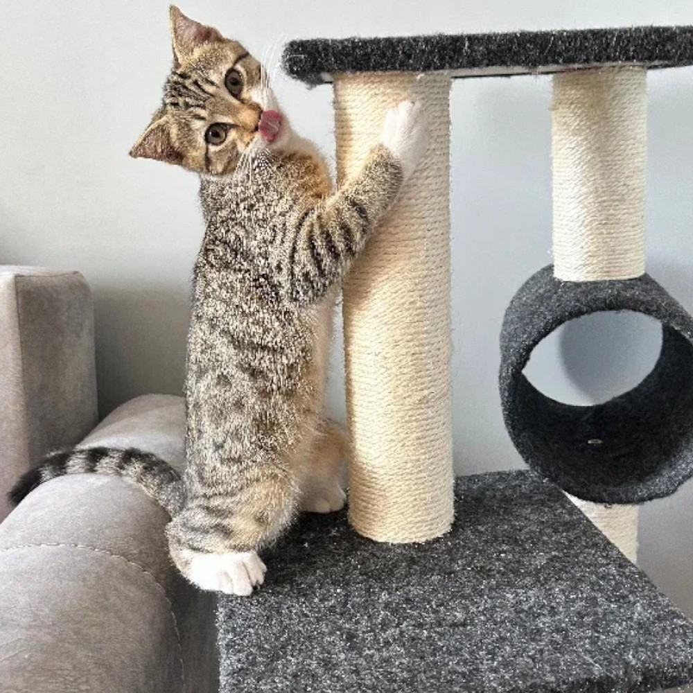 Столбики когтеточки покрыты натуральным сизалем, прекрасно подойдут для стачивание когтей. Размер когтеточки: 35х35х105 см.
