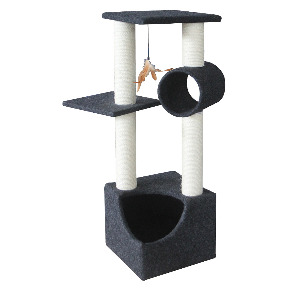 Игровой комплекс когтеточка для кошек в классической черно-белой гамме станет отличным выбором для времяпрепровождения вашего питомца. Домик - удобное место для сна, где ваша кошка будет чувствовать себя защищено. Две разноуровневые площадки и тоннель - это прекрасная возможность для кошки проявить свою ловкость и активность. Подвесная игрушка сделает жизнь кота интереснее.