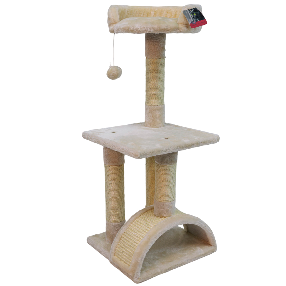 Когтеточка для кошек в кремовом цвете представляет собой мини-игровой комплекс. Столбики, покрытые сизалем - это прекрасная возможность для питомца стачивать когти. Верхняя площадка когтеточки может использоваться кошкой как наблюдательный пункт, а подвесная игрушка разнообразит досуг и позволит реализовать охотничьи инстинкты. Размер когтеточки: 36х36х88 см.