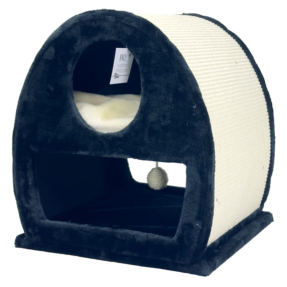 Оригинальный полукруглый домик когтеточка с лежанкой и игрушкой украсит любой интерьер. На втором ярусе когтеточки размещается уютный домик для кошки. Маленький овальный вход создает ощущение защищенности для питомца. На нижнем ярусе когтеточки лежанка и подвесная игрушка.